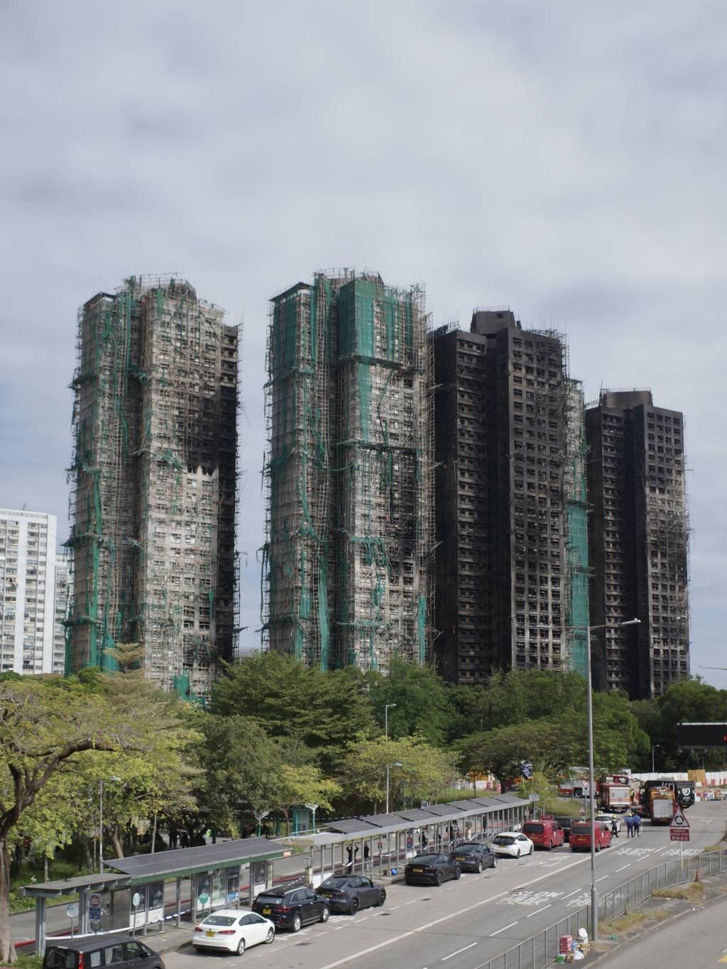 拍摄于11月27日下午5时左右的照片显示,当时宏建阁仍有整片的棚网,而宏仁阁、宏志阁所剩的棚网像撕裂的长条挂在上面,竹脚架(即竹棚)乱七八糟地搭着。宏昌阁、宏泰阁、宏新阁的棚网几乎烧光了,裸露出漆黑的楼壁、窗台。