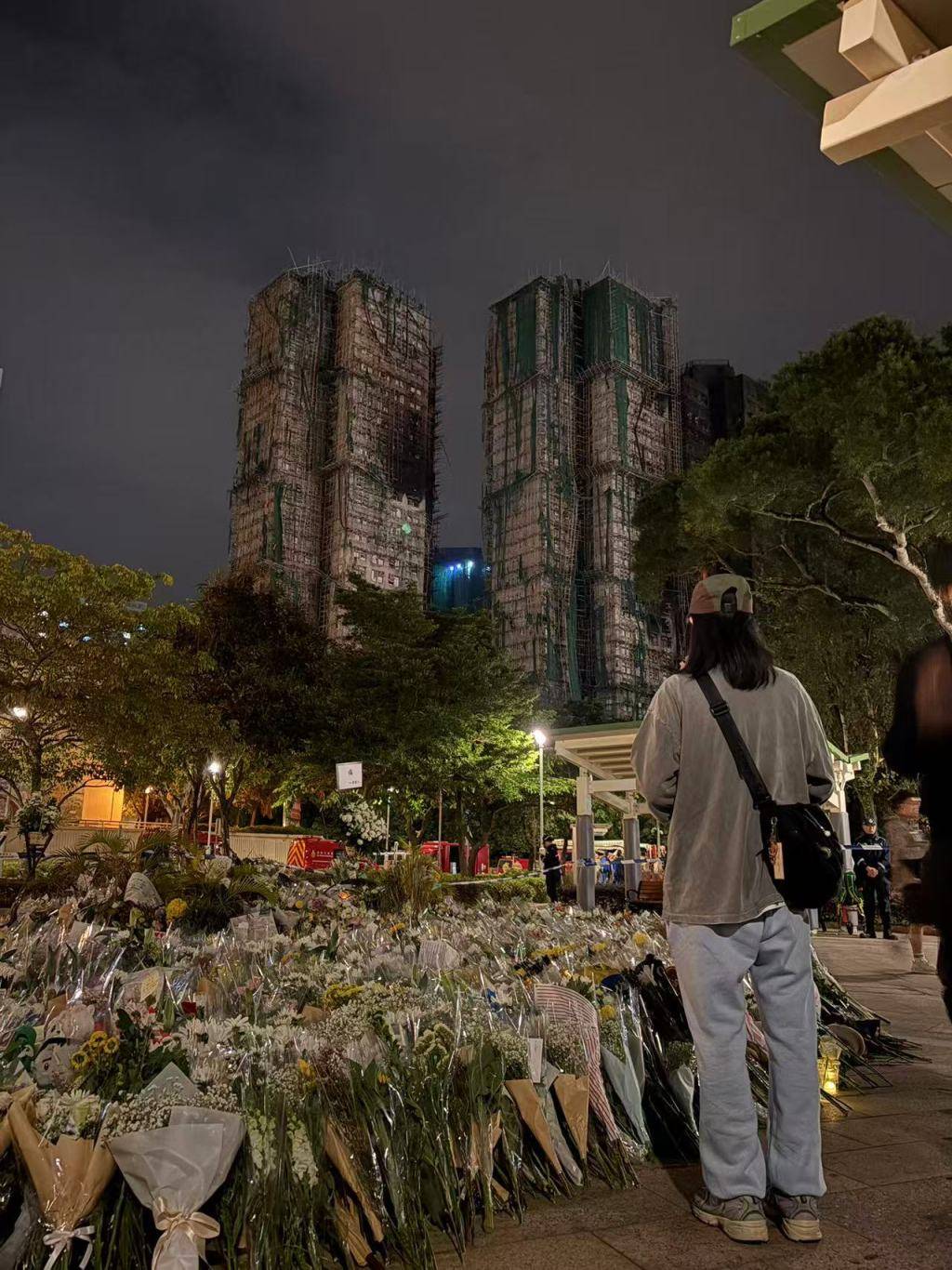 11月30日晚,宏福苑旁的广福商场,市民在献花悼念。